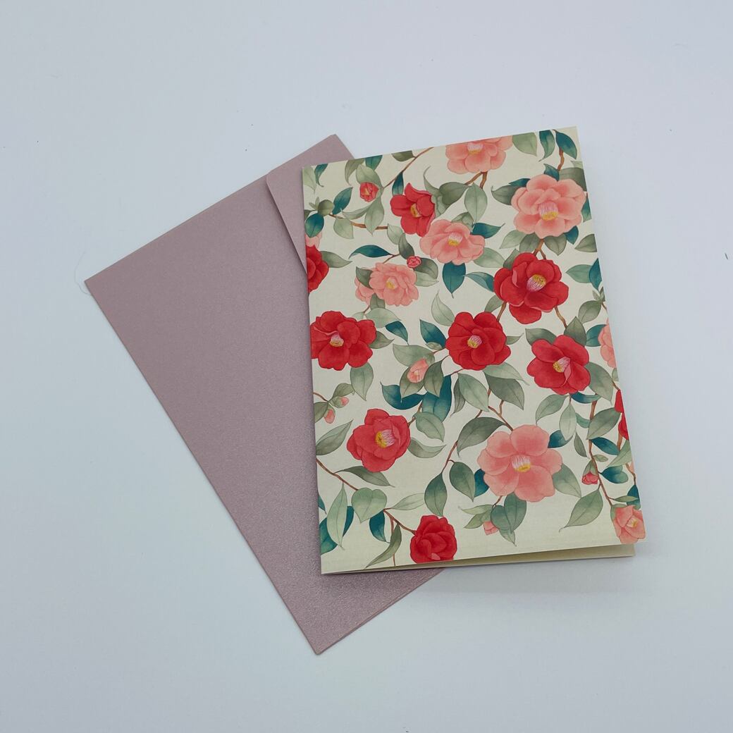 カードの全面にプリントされた椿の花と淡い色の紙が可愛いメッセージカードです。感謝を伝えたいときや、贈り物に一言添えたいときなど、様々なシーンで活用出来ます。